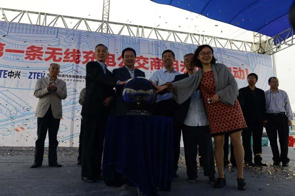 下图为无线充电大巴商用示范线启动仪式上,我校陈乾宏教授(前排右1)、严仰光教授(前排右2)与中兴通讯股份有限公司董事长侯为贵(前排左1)、湖北省委常委襄樊市委书记/纪委王君正(前排左2)、东风汽车集团股份有限公司副总经理欧阳洁(前排左3)共同触摸水晶球,宣布无线充电大巴商用示范线正式启动。