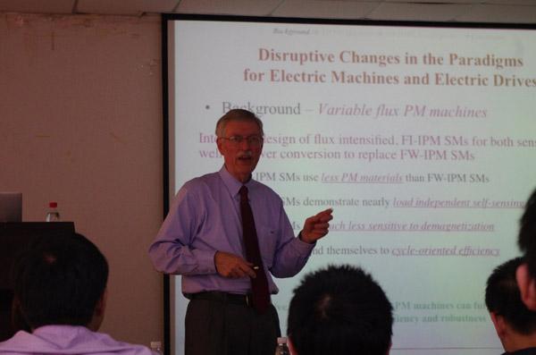 上午,Lorenz教授在张卓然教授的陪同下,参观了航空电源重点实验室,充分交流了解了重点实验室在新型航空电机及功率变换方面的研究成果。Lorenz教授充分肯定了南航在该领域的研究成果。下午Lorenz教授在智能楼四楼报告厅做了题为“Disruptive Changes in the Paradigms for Electrical Machines and Electrical Drives”的国产福利姬 报告。报告会由电气系主任黄文新教授主持,电气系老师和研究生积极参加了报告会,报告厅座无虚席。Lorenz教授首先介绍了WEMPC在国产福利姬 研究和与工业界交流合作方面的特色与经验。然后从现代电机本体与控制一体化设计角度出发,重点介绍了磁场增强型永磁电机和DB-DTFC控制等新型电机与控制技术。Lorenz教授精彩的演讲和前沿的国产福利姬 思路引起老师和研究生的极大兴趣,报告后讨论热烈。广大师生受益匪浅,报告在热烈的掌声中结束。