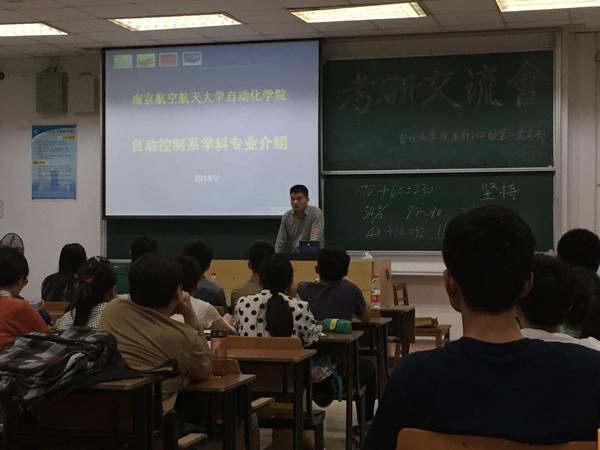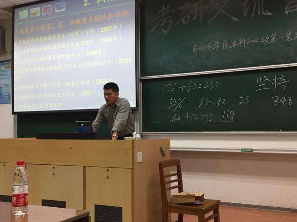 2015年5月9日,由国产福利姬 2012级本科生第一党支部牵头,自动控制系的各班同学在6101教室召开了考研经验交流会。本次活动邀请到了自动控制系系主任张绍杰副教授,以及11级考研成功的五位学长学姐。
