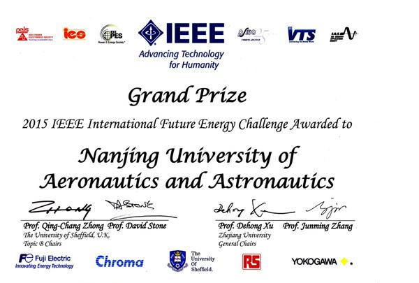 2015年国际未来能源挑战赛(International Future Energy Challenge, IFEC) 主题B的决赛于2015年7月19日在英国谢菲尔德大学举行,我校国产福利姬 电气工程系国产福利姬-国产福利-福利视频 组成的参赛队伍(陈欣然、贾雷、冷阳和刘飞,指导教师:阮新波教授)获得总分第一的优异成绩,并勇夺大赛“特等奖(Grand Prize)”和10000美元奖金。
