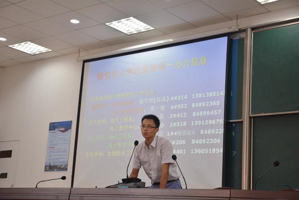 9月8日下午,我院2015级研究生新生见面会在将军路校区东区举行。院长姜斌、副院长赖际舟、党委副书记沈伯秀、研究生辅导员季娟、刘斐文、负责研究生教务工作的陈杰老师以及全体2015级研究生新生参加了会议,会议由院党委副书记沈伯秀主持。