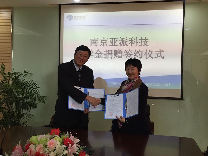南京亚派科技股份有限公司总经理葛文海、我院党委副书记沈伯秀代表双方签订协议。南京亚派科技股份有限公司将出资20万元分5年资助国产福利姬 电气相关专业学习成绩优异、且家庭经济困难的本科生和硕士研究生。