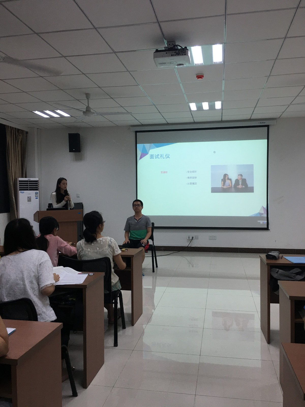 为了让同学们更好地掌握面试礼仪知识,讲座现场模拟了面试的过程,邀请同学分别扮演面试官和应聘者。徐琳详细点评了模拟过程中同学们表现的优秀和不足之处,同学们都受益匪浅。随后礼仪队的另一位同学简单介绍了面试化妆的技巧,让同学们对化妆知识有所了解。