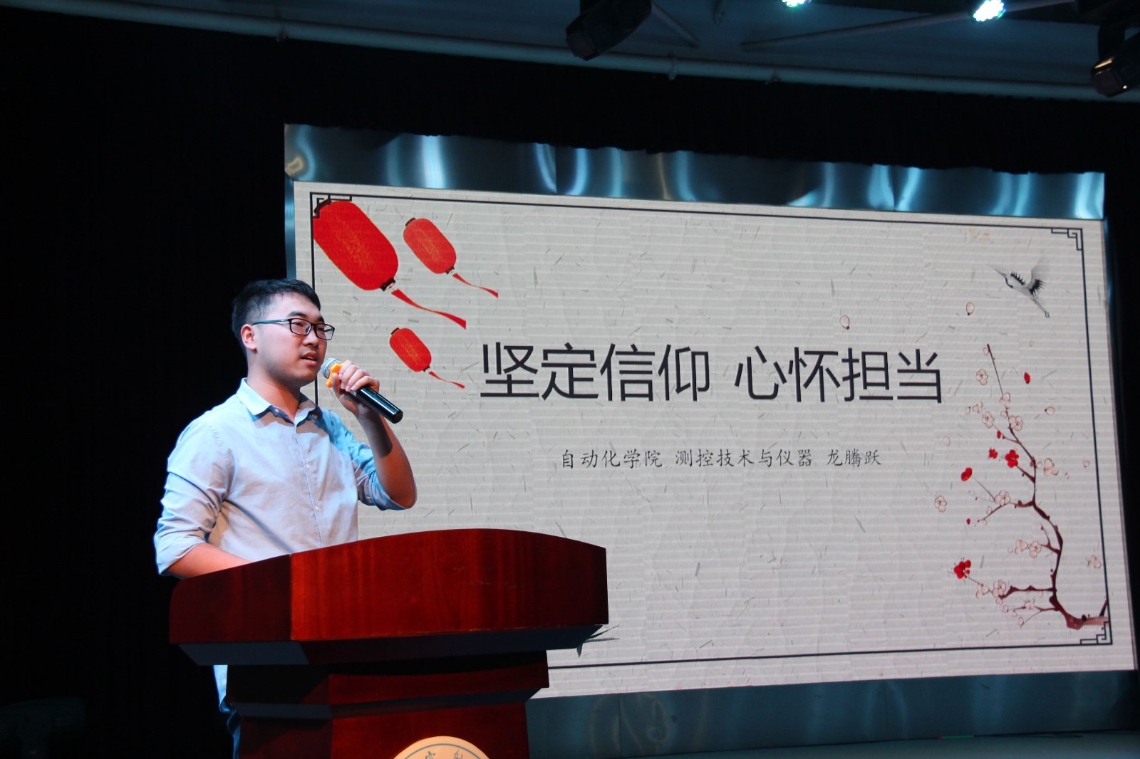 “坚定信仰,心怀担当”——2017-2018学年年度特别嘉奖之担当奖获得者龙腾跃围绕“习惯、经历、担当、思考”四个关键词动情地讲述了自己刚进入大学的连环挫折、直面挫折后的艰苦奋斗、努力后成功的喜悦与满足,鼓励新生“让优秀和努力成为一生的习惯”。